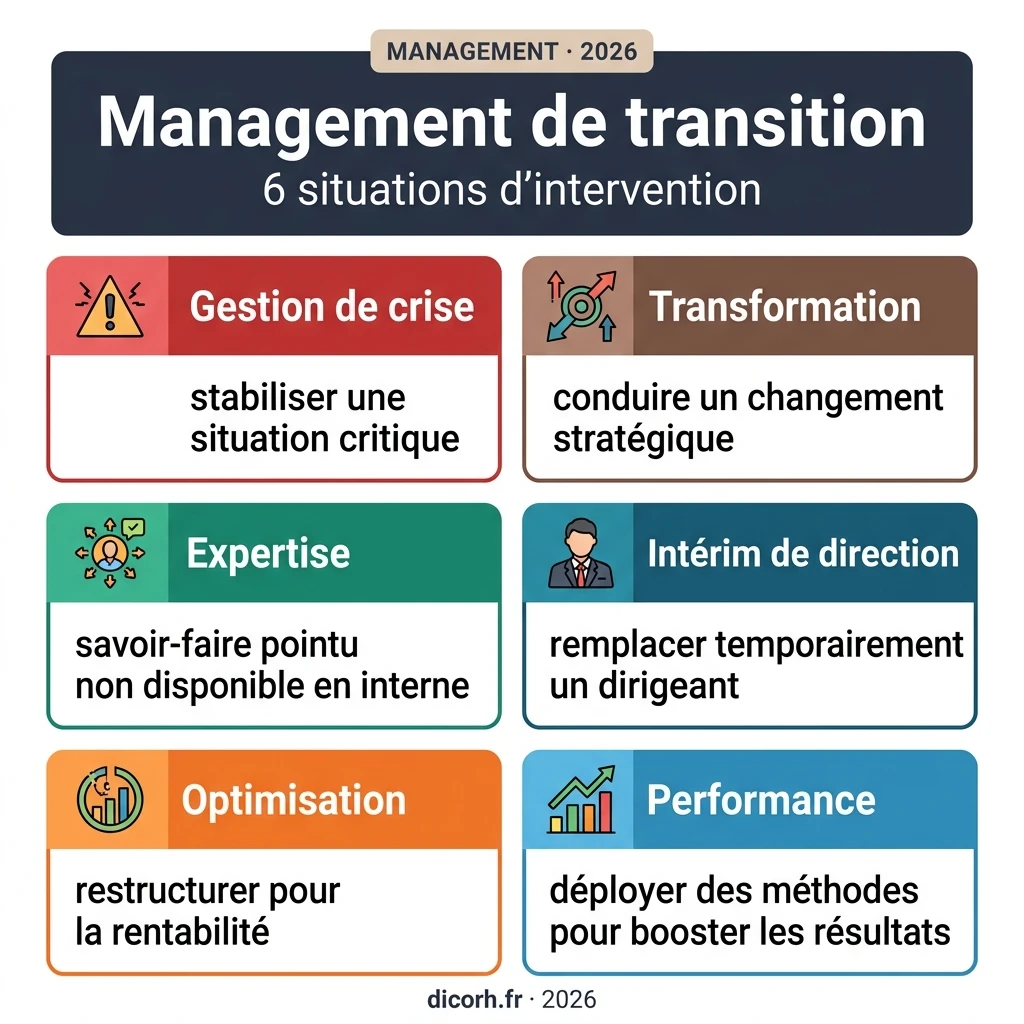 Le management de transition, aussi appelé gestion de transition, est une solution temporaire où une entreprise recrute un manager de transition ou un leader intérimaire hautement qualifié pour gérer une situation spécifique, souvent critique. Ce cadre intervient pour des missions de transition stratégiques comme la gestion de crise, la restructuration, ou l’accompagnement en transition. Le manager intérimaire apporte une expertise rapide et ciblée pour résoudre un problème précis ou conduire un projet, généralement sur une période de quelques mois.